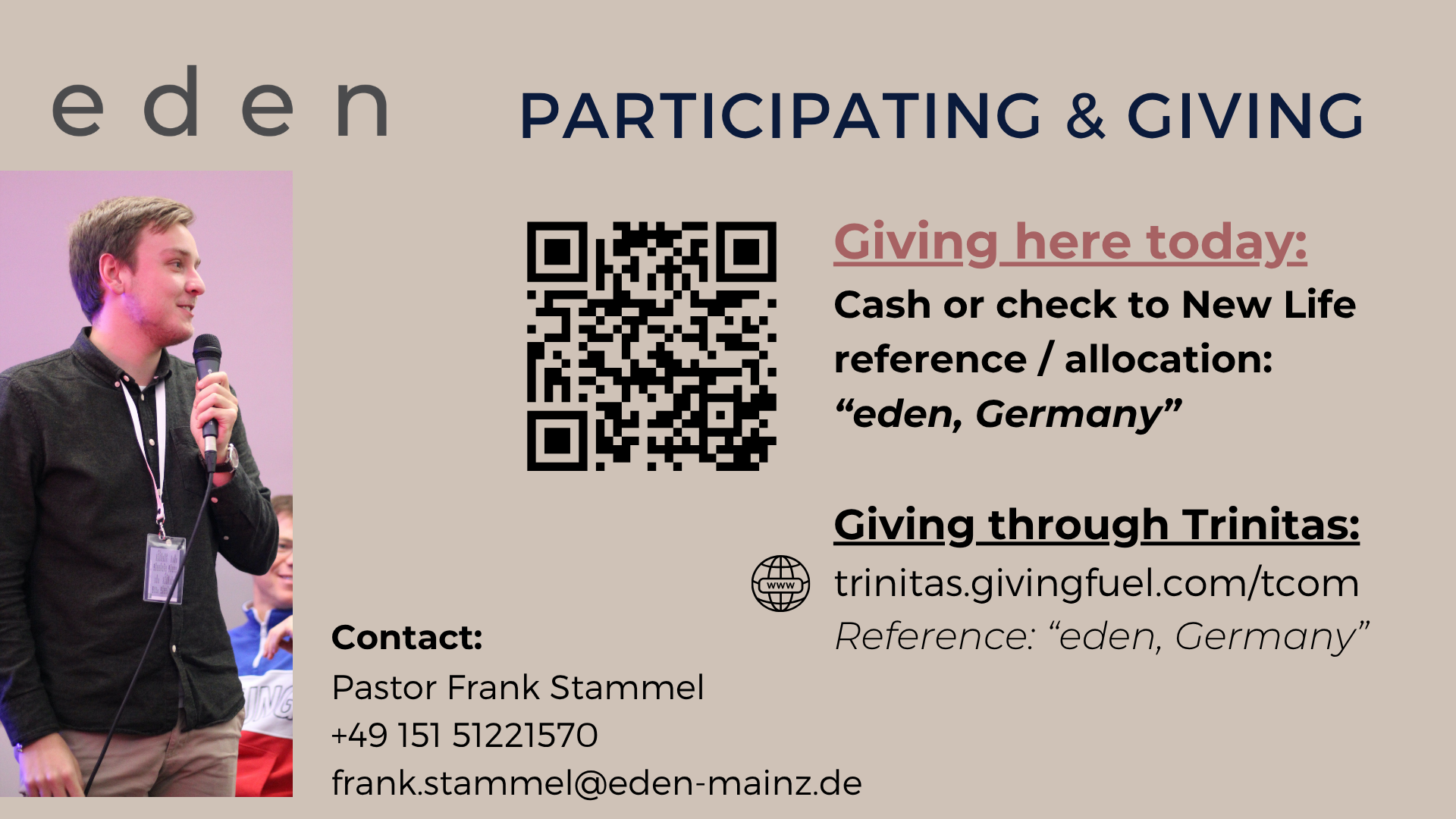 Occasionally we will announce a short designated giving campaign for a specific cause. This autumn we invite you to support Becci & Frank Stammel, our good friends who serve as Urban Missionaries in Germany, one of the most unchurched countries. Frank is the lead pastor of eden Church of the Nazarene in Mainz. You can use this link to give directly to them through our Trinitas network connection: https://trinitas.givingfuel.com/tcom